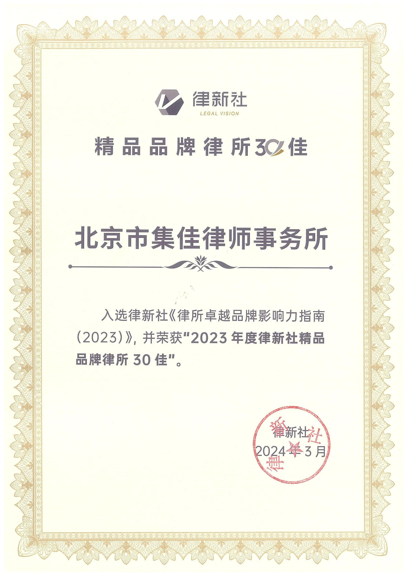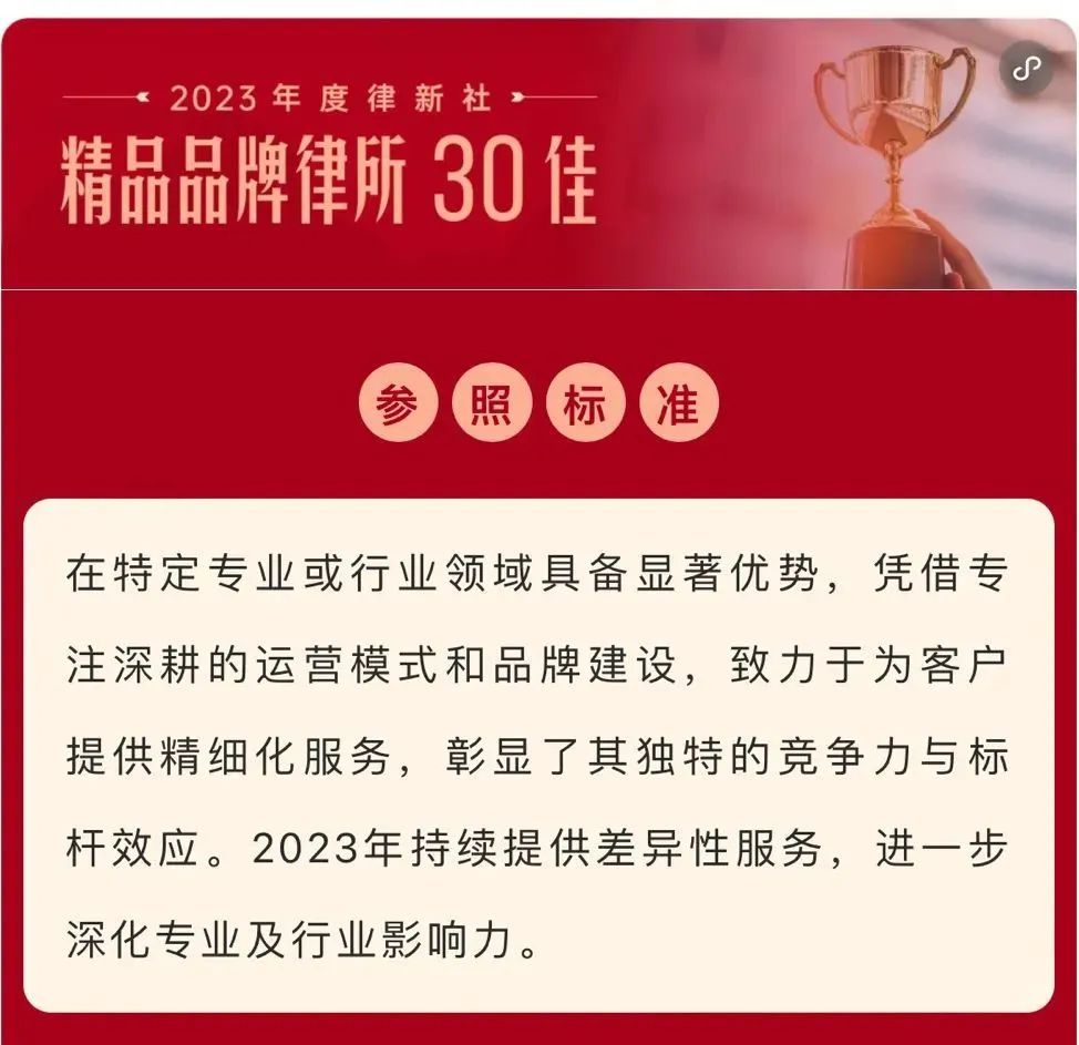 >玩球直播>关于我们>荣誉概览>2024>玩球直播入选 “2023年度律新社精品品牌律所30佳”