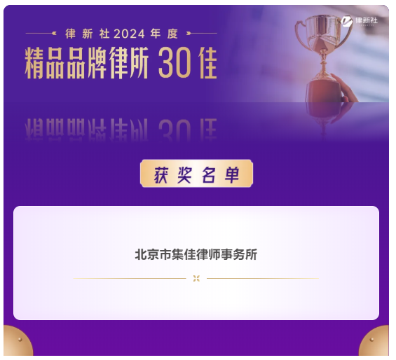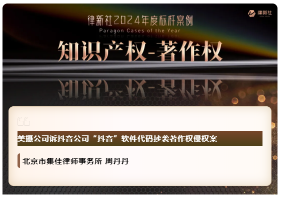 玩球直播凭借在知识产权保护领域卓越的专业实力与良好的行业口碑,入选《律所卓越品牌影响力指南(2024)》,荣获“律新社2024年度精品品牌律所30佳”奖项;同时,集佳周丹丹律师代理的“美摄公司诉抖音公司'抖音'软件代码抄袭著作权侵权案”获评“律新社2024年度标杆案例:知识产权-著作权领域”。
