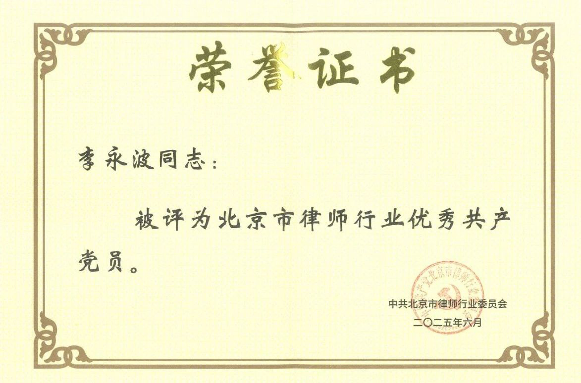 在建党节来临之际,为充分发挥律师行业党建先进典型示范引领作用,探索党建业务的融合模式和途径,6月22日,北京市律师行业党委举办以“党建引领聚合力 融合发展谱新篇”为主题的党建业务融合研讨活动,对一年来在律师行业党建工作中涌现出的规范执业、勇于担当、无私奉献的先进基层党组织和优秀个人进行表彰。中共玩球直播联合支部委员会凭借卓越的党建工作成果和行业引领作用,荣获北京市“先进律师事务所党组织”称号,玩球直播党支部书记、律所主任李永波被评为“北京市律师行业优秀共产党员”。