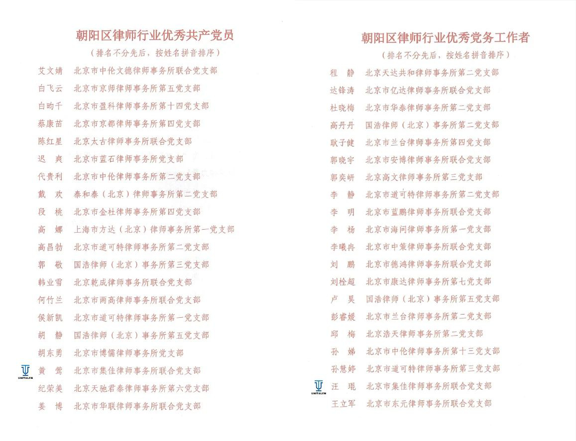 6月27日,朝阳区律师行业党委召开了朝阳区律师行业庆祝中国共产党成立104周年暨总结表彰大会,玩球直播联合党支部党员黄莺荣获“朝阳区律师行业优秀共产党员”称号,支部党员汪琨荣获“朝阳区律师行业优秀党务工作者”称号。