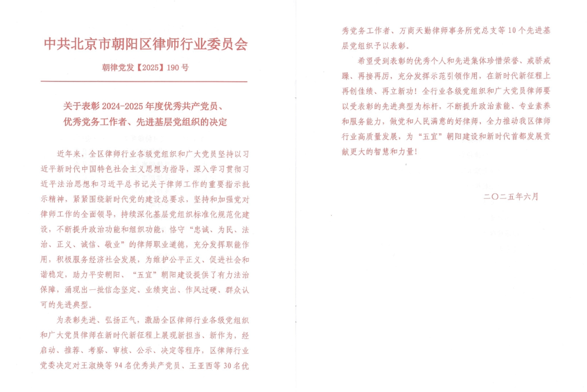 >玩球直播>关于我们>荣誉概览>2025>中共玩球直播联合支部委员会获评北京市“先进律师事务所党组织”光荣称号 多位优秀党员获得表彰